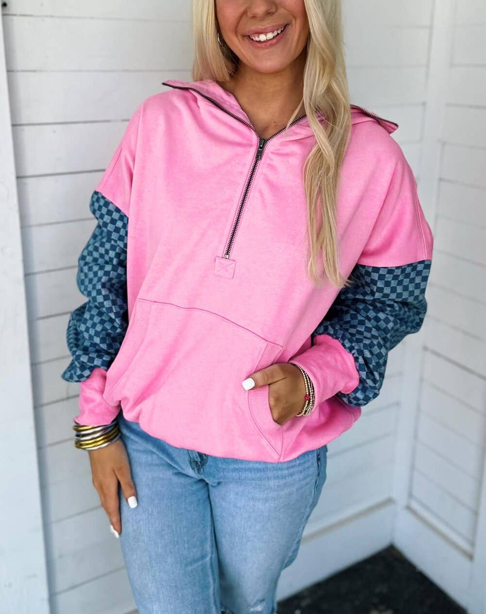 This casual hooded sweatshirt must be your new favorite. Features a pair of contrast plaid patchwork sleeves. It has a half zip closure, draw-cord hood, and front pocket. The relaxed style is well-received by different body shapes.